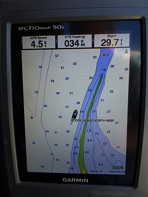 In the morning we bought pastries and coffee off Aldo's Bakery Boat that was working the anchorage. What a delight! Leaving Block, you have to watch the tide doesn't set you over the reef at the north end of the island. It is alarming to look over the side and see gravel and clams going by sideways under the boat, miles from shore