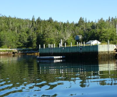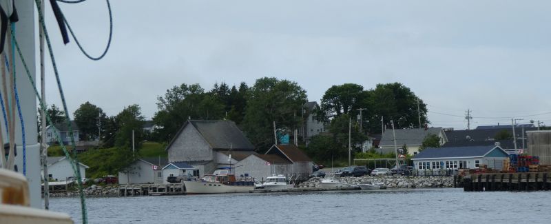 We had intended to anchor behind Saddle Island but a large aquaculture operation filled the anchorage. We moved on through the rapidly fading light to Aspotogan. This is a tiny fishing harbor. We ended up mooring to a floating dock recommended by a couple of people fishing from a broken-down wharf. The little floating dock with its wharf seemed to have no connection to anything. There was no vehicular access from the land side, altho' the road was nearby. As darkness fell and tide rose, Bo had to wrap the metal dock 'sliders' with duct tape, they absolutely squealed with the slightest motion of the water and tide.