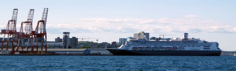 As we approached Halifax, a beautiful wind came up and we blasted through Halifax Harbor on a reach. Halifax Traffic, running on the radio, had lots of communication. AIS beacons so thick on shoreline that the GPS was a sea of red. A supremely blunt and high ro/ro (roll on/roll off car carrier) went by the other way. A huge cruise ship backed out of a dock almost blocking the harbor and thrustered its way around to leave port. Then, downtown, Tall Ships! Lots of them. We had seen them in Boston in mid-June. We'd had no idea they would be here In Halifax more than a month later.