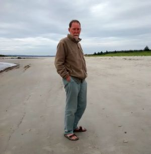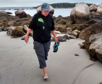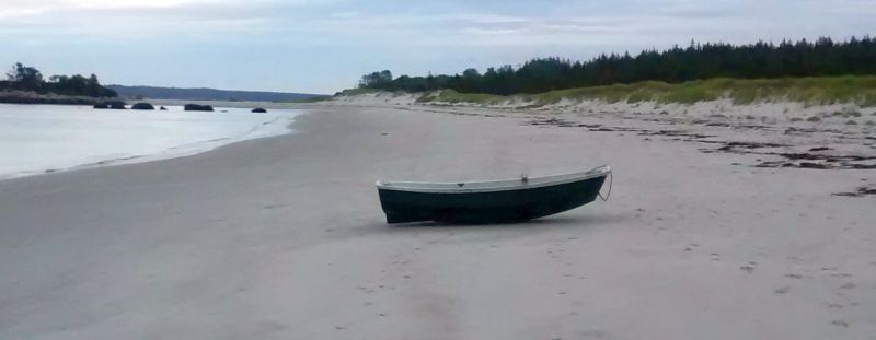 We arrived at Port Mouton ("Port Meh-Toon") late in the afternoon, threaded our way through two narrow places to a beautiful anchorage off a white-blond sand beach. After a quick dinner, we rowed in for a long walk, first toward town up the road, but then back across the tidal streams and down the beach. This was a phenomenal fine, sandy, beach, crossed by a gentle stream of ebbing tidewater - Carters Beach. A lovely evening in July and just one other person on the beach.