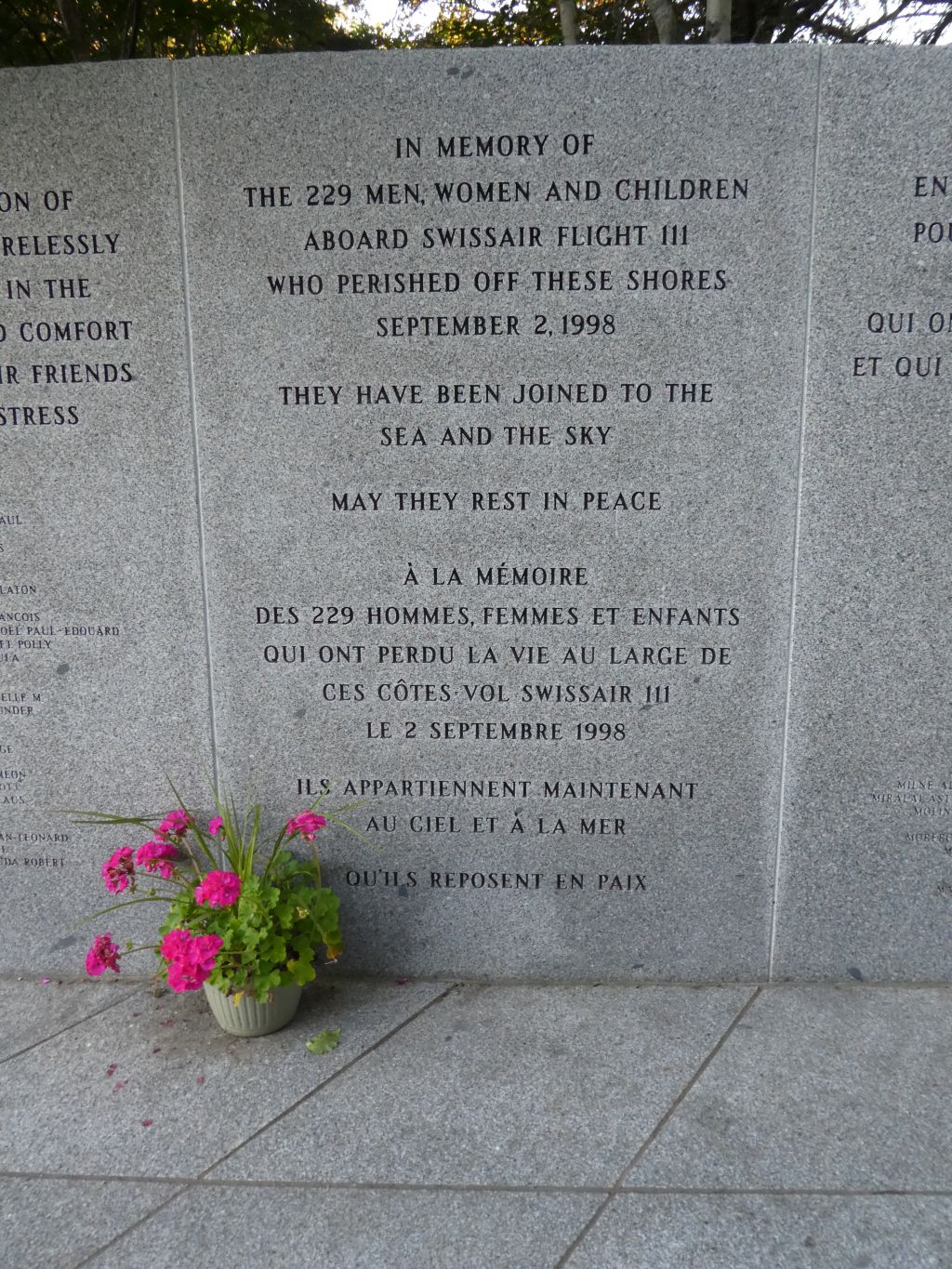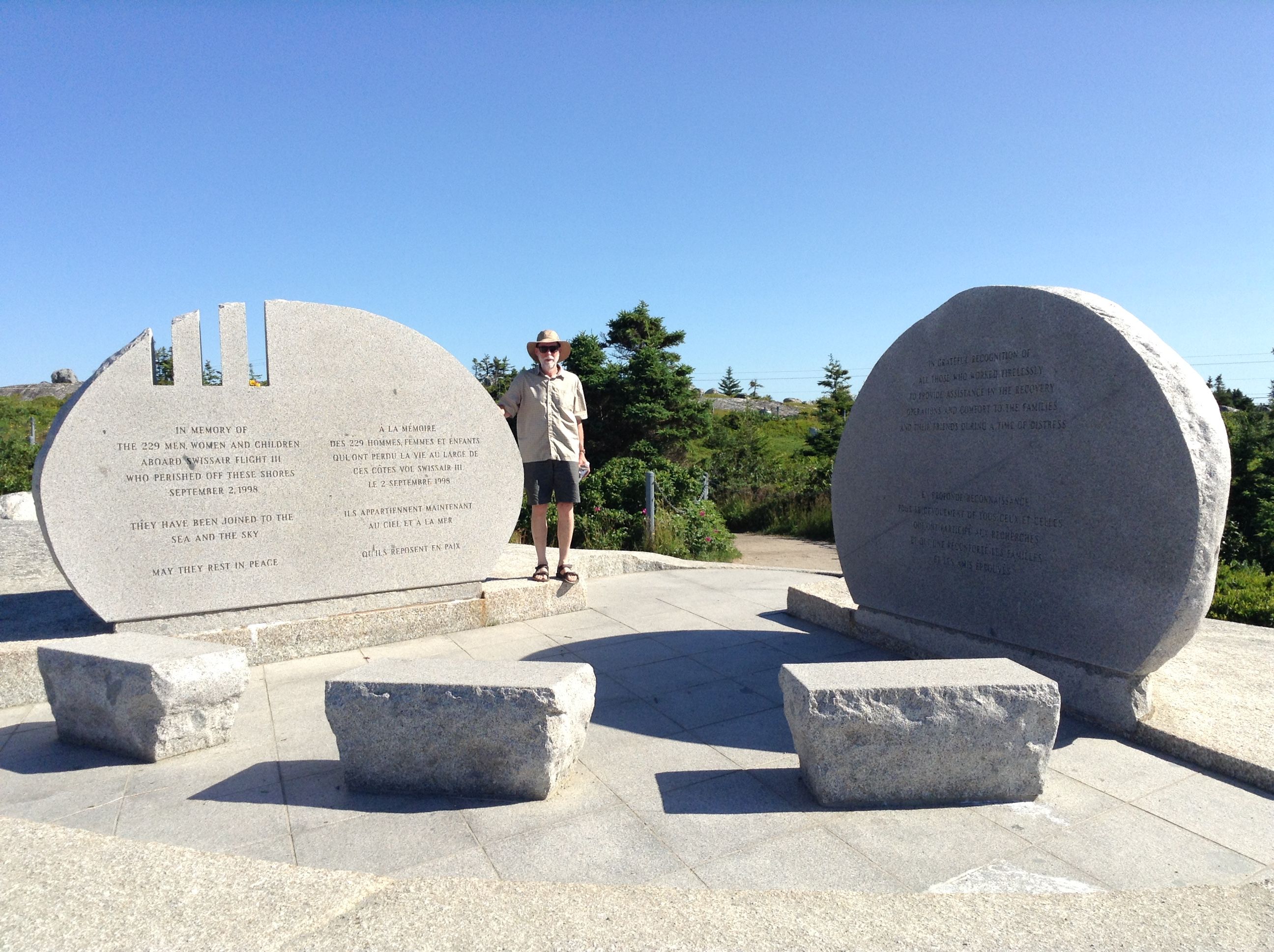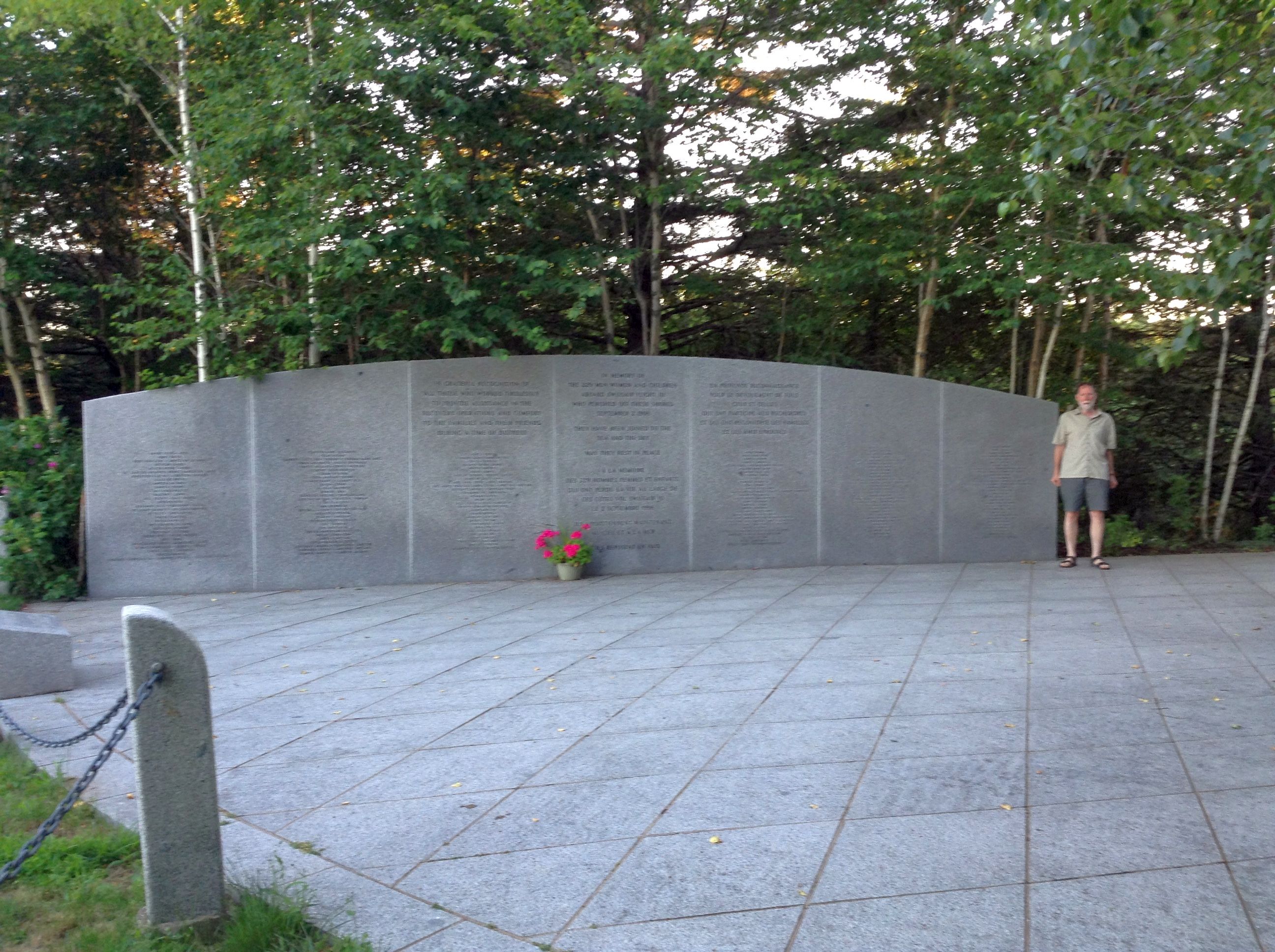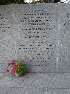 The memorial is very moving. The location, along with the Peggy's Cove (Whalesback) memorial site, triangulate on the location of the crash allowing visitors to get a sense of where it is, 5 miles offshore. This memorial site, tucked in the trees and on a quiet stretch of road, feels more private than the one near Peggy's Cove. This seems appropriate as the remains that were not identified are interred here. Memorial panels list the crew and passengers that were lost.