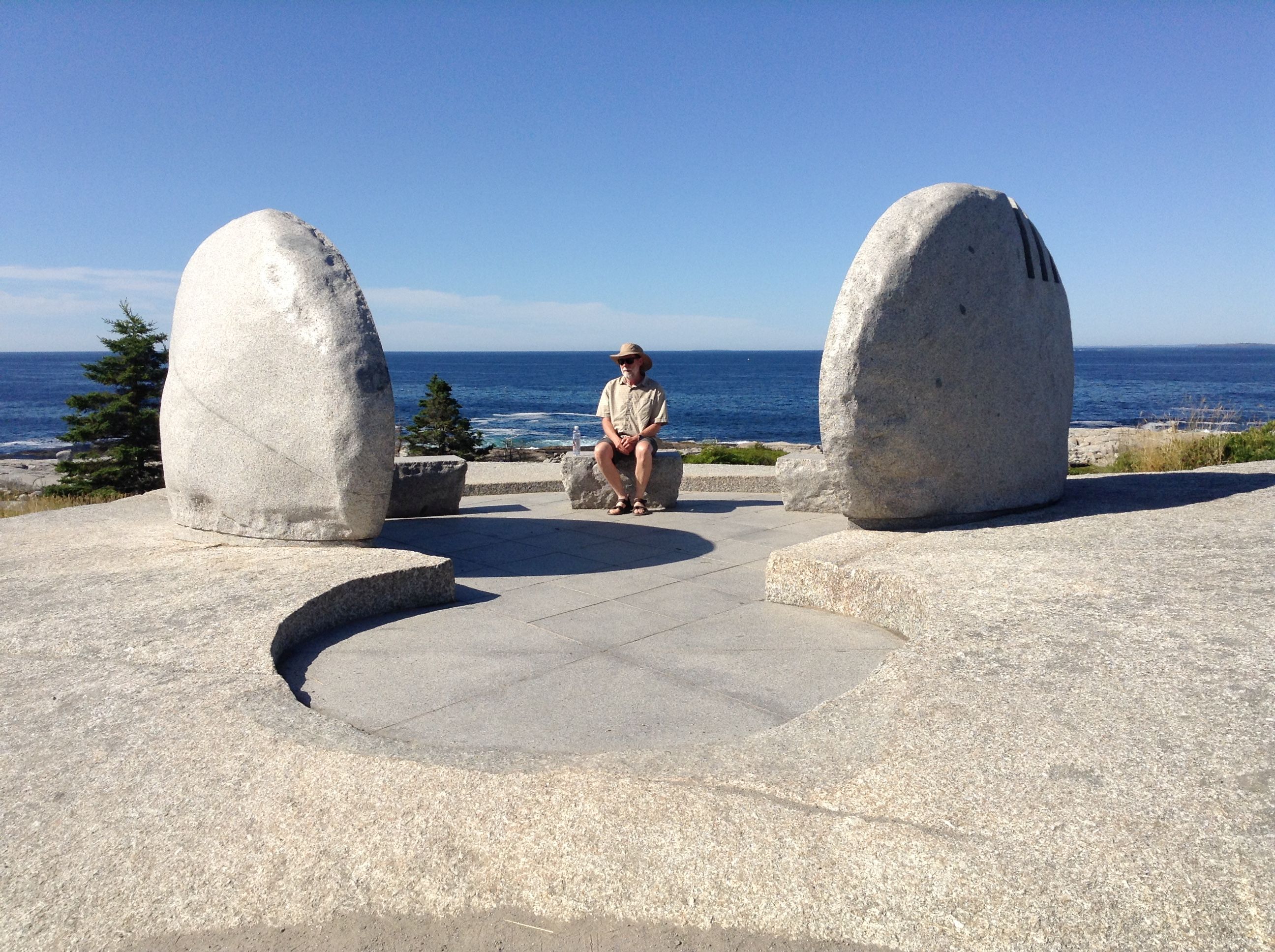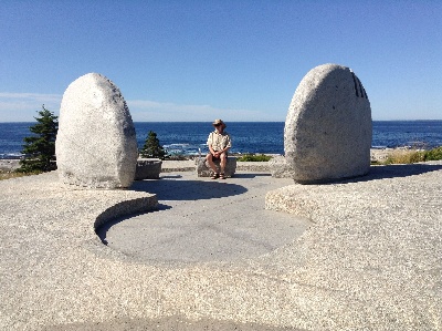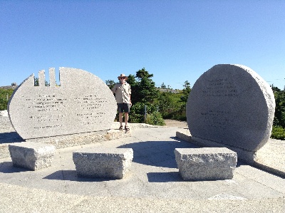 Our goal this morning was to find the other memorial, which we could see wasn't actually in Peggy's Cove itself, which is a tiny cove filled to the brim with tourists. Turns out it's at Whalesback, a couple miles northwest of Peggy's Cove. We motored across St Margaret's Bay to Indian Harbor. This seemed to be the closest approach to the memorial by boat, about 2 miles by road. We went ashore at what was marked as a government wharf on the chart - and was, formerly - but turned out to be private property. No one bothered us about that. We started walking but didn't have a good idea how far it was to the Memorial, and were worried about leaving Enetai anchored for too long in the small cove. The hostess at the Rhubarb Restaurant (who seemed incredulous that we didn't think it was an easy, 20 minute walk) gave us a ride about 1-1/2 miles to the Memorial. We'd already walked more than half mile on a highway with no sidewalks, and we walked back, so we got a good workout in and appreciated the break.